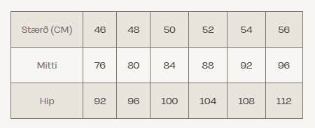 | Mjöðm (cm) | 80 - 88 | 88 - 96 | 88 - 96 | 96 - 104 | 96 - 104 | 104 - 112 | 104 - 112 | 112 - 120 | 112 - 120 | 120 - 128 | 120 - 128 | 128 - 136 | 128 - 136 | 136 - 148 | 136 - 148 |