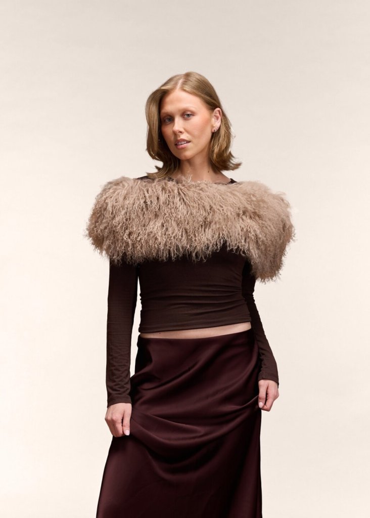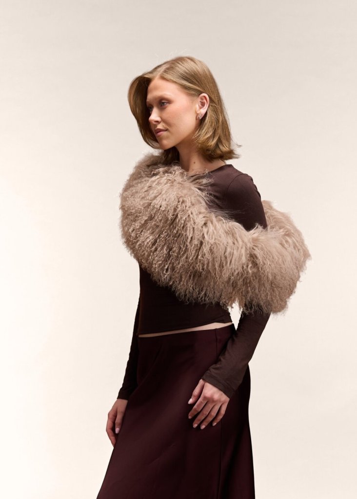 Myrkvi er flottur loðkragi framleiddur úr hágæða tíbet lambaskinni. Skinnið er náttúrulega krullað sem gefur kraganum einstaklega skemmtilega áferð. Myrkva kragann er hægt að nota við Dimmu ermastúkurnar. Parið getur breytt einföldum jakka í einstaka flík. Kraginn er hannaður með klemmur á báðum endum svo hægt er að festa hann á allskonar jakka, kjóla og blússur. Hann er einnig hægt að krækja saman og smeygja yfir aðra öxlina, fyrir nýstárlegt og skemmtilegt look.