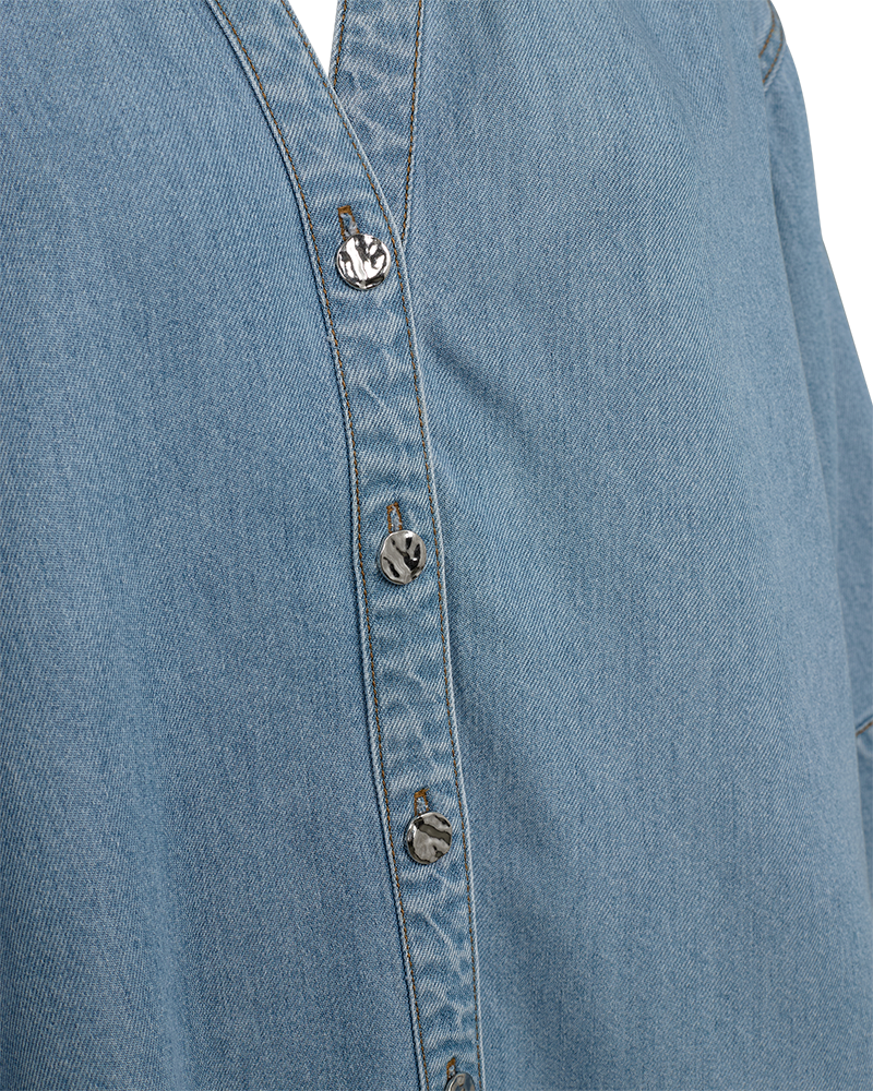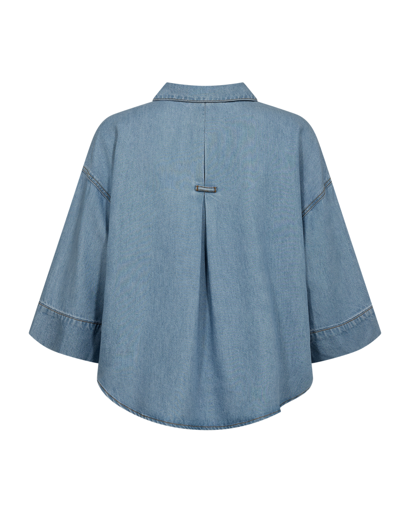 Skyrta frá Freequent úr mjúku gallabuxnaefni. Skyrtan hefur einfalt útlit með hnappafestingu, V-hálsmál, fellikraga og langar breiðar ermar