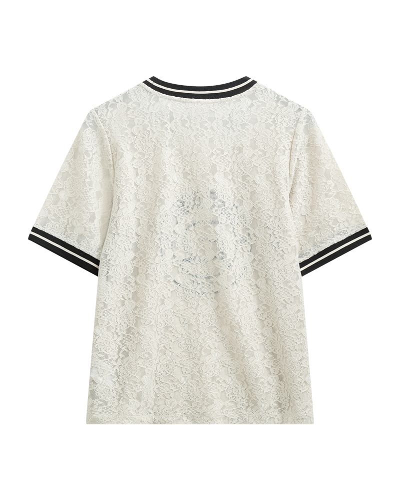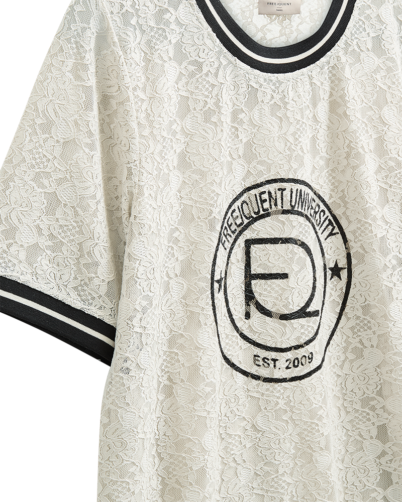 Bolur frá Freequent úr fallegu, blómóttu blúnduefni. Bolurinn er einfaldur í hönnun með merkiprenti að framan á auk límbandsdetalja í kringlóttum hálsmáli og breiðum þriggja fjórðu ermum.