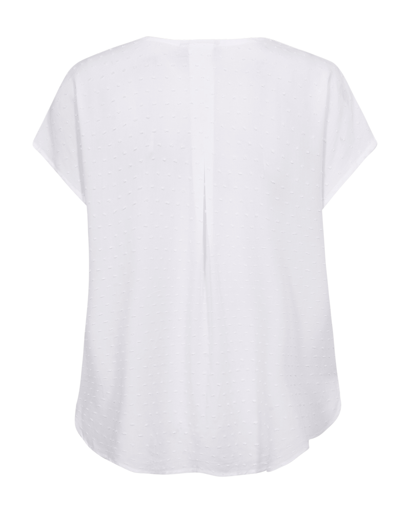 Blússa frá Freequent úr léttu efni með áferðarmynstri. Blússan hefur einfalt útlit með lausum sniði, v-hálsmál, stuttum ermum og fellingu að aftan.