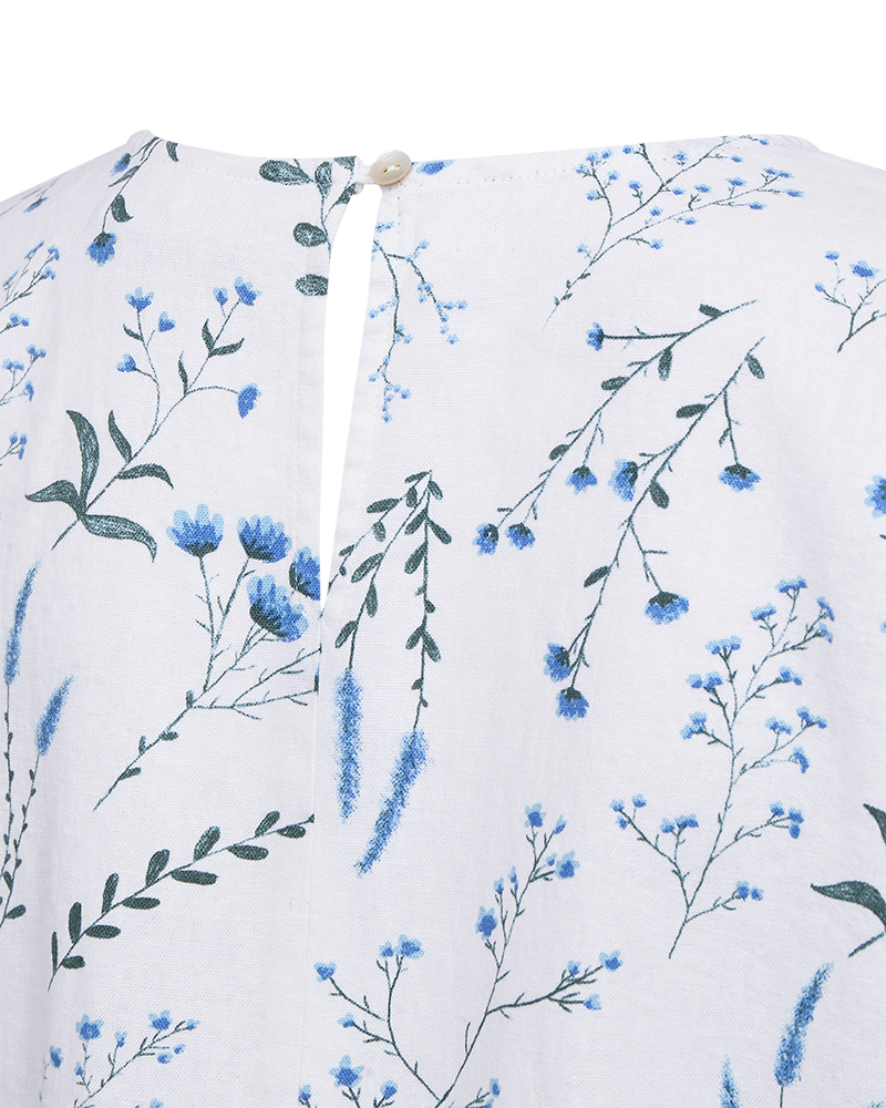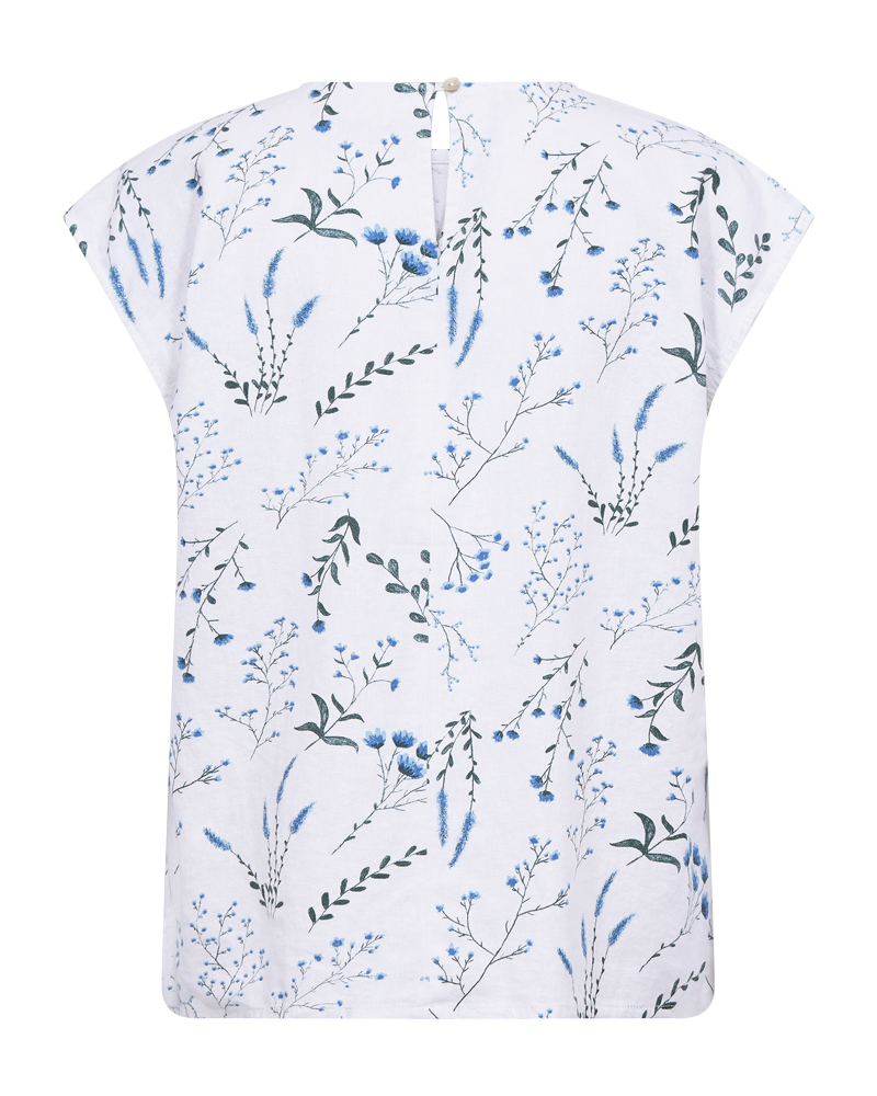 Blússa frá Freequent úr línefni. Blússan hefur einfalda útlínu með kringlóttum hálsmáli, hnappafestingu við hálsmálið og stuttum ermum
