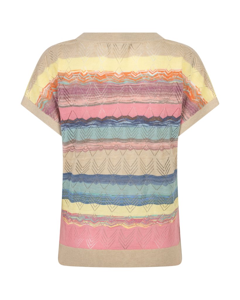 Jerry Multi Stripe er opinn prjónaður toppur með stuttum ermum og venjulegu sniði. Efri hlutinn hefur klipptar ermar, hringlaga hálsmál og ribbaðan fald við ermar, háls og neðst.