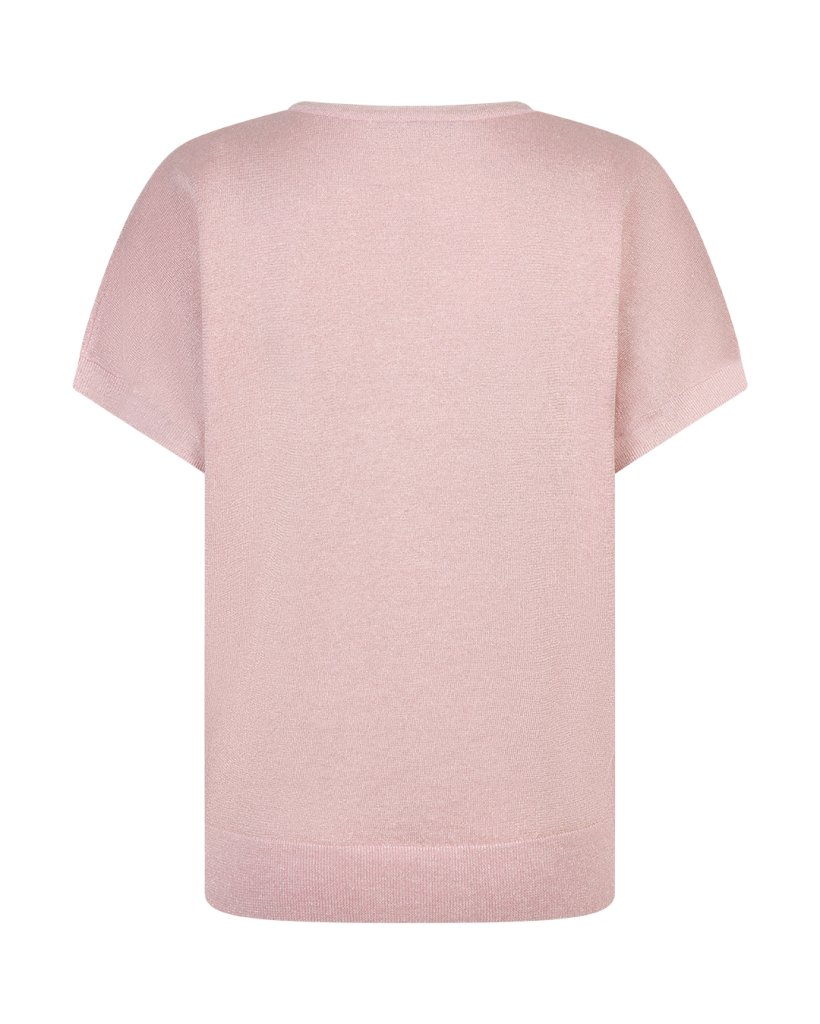 Jerry Sparkle er fínn prjónaður toppur með stuttum ermum. Efri hlutinn er með V-hálsmáli með rifnum brún meðfram hálsinum, við enda ermanna og neðst. Prjónið hefur léttan glimmer sem gefur toppnum fallegan glans.