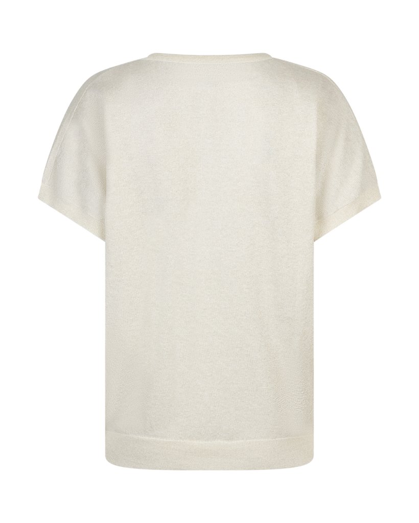Jerry Sparkle er fínn prjónaður toppur með stuttum ermum. Efri hlutinn er með V-hálsmáli með rifnum brún meðfram hálsinum, við enda ermanna og neðst. Prjónið hefur léttan glimmer sem gefur toppnum fallegan glans.