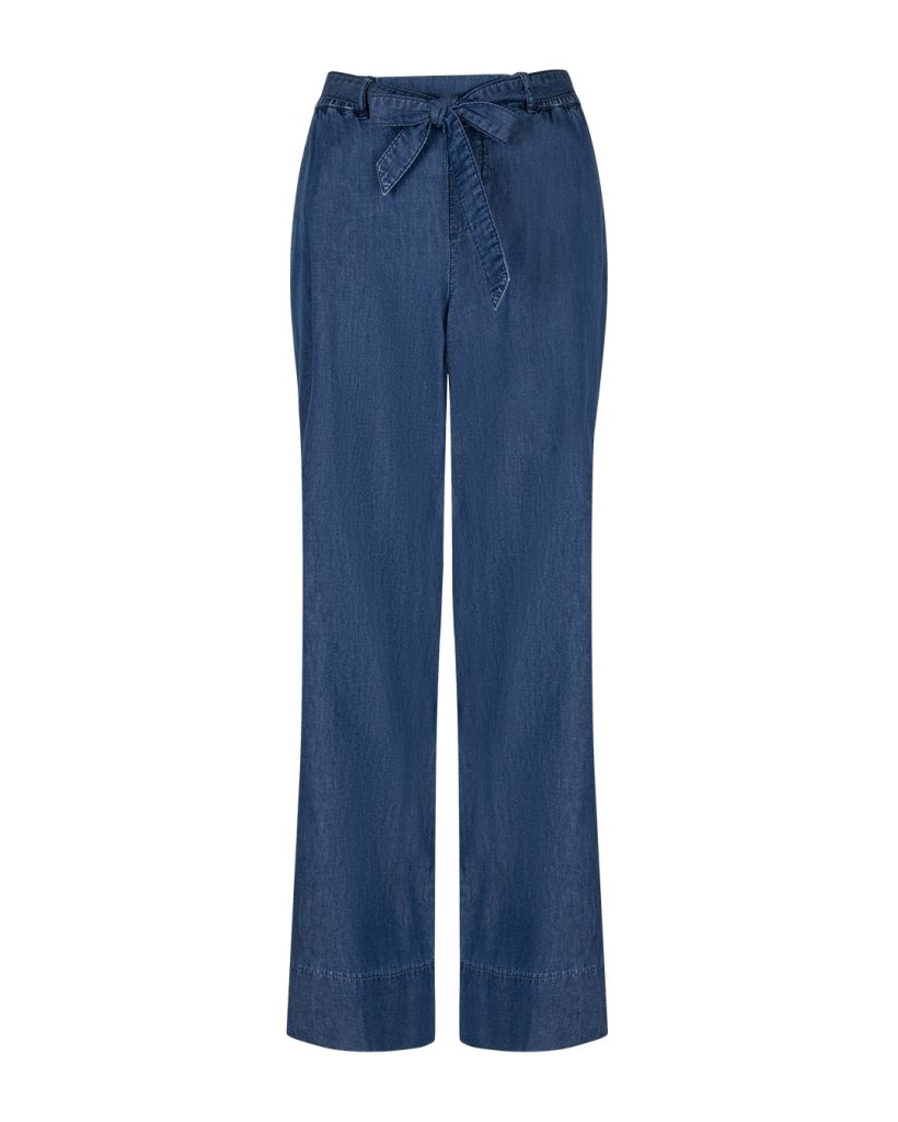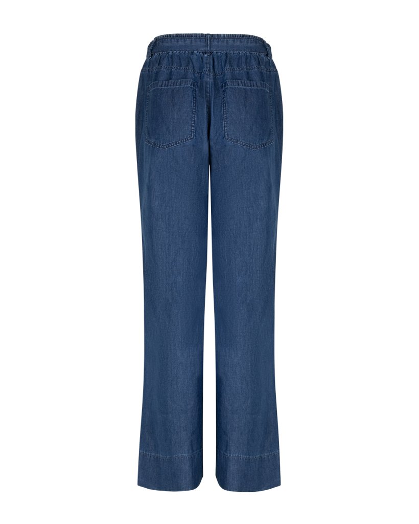 Claudette Palazzo Denim skolið er breiðar palazzo-buxur með djúpbláum þvotti. Buxurnar eru sniðnar við mjaðmir og víkka frá læri. Claudette Palazzo Denim skolið hefur hátt mitti, venjulegt snið og belti í mittinu