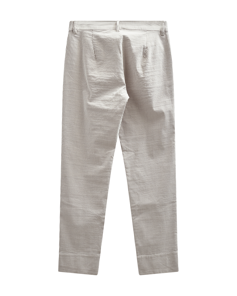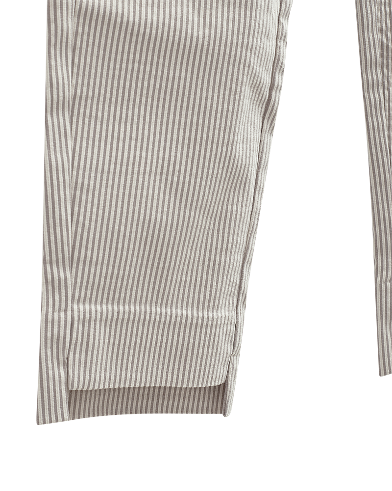 Buxur frá Freequent úr mjúku efni með röndum. Buxurnar eru einfaldar með þröngu sniði, hnappum og rennilás, háu mitti, hliðarvösum og rifum í ökklalöngum fótleggjum.