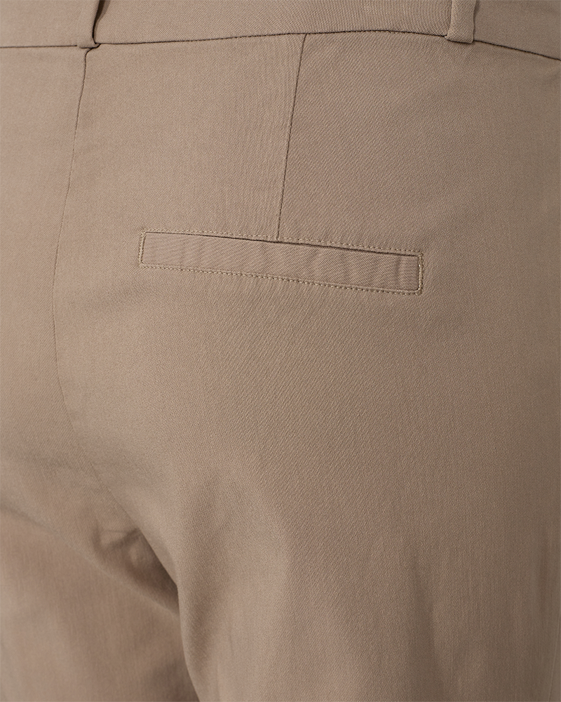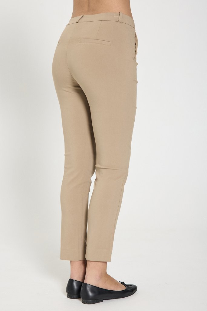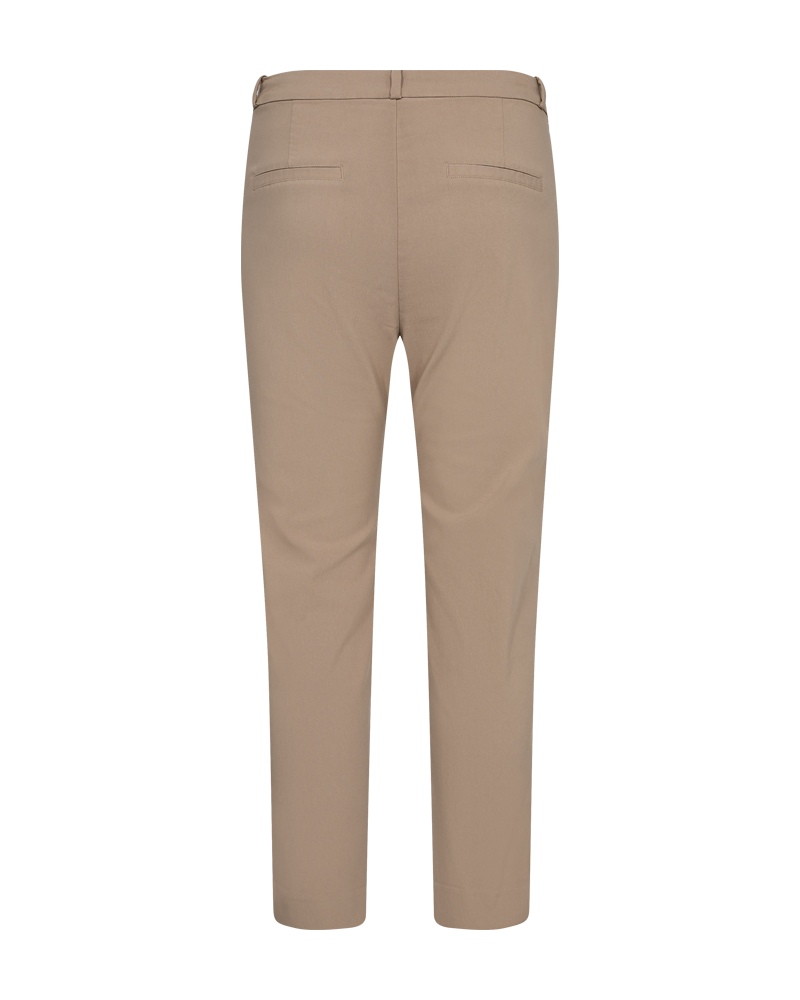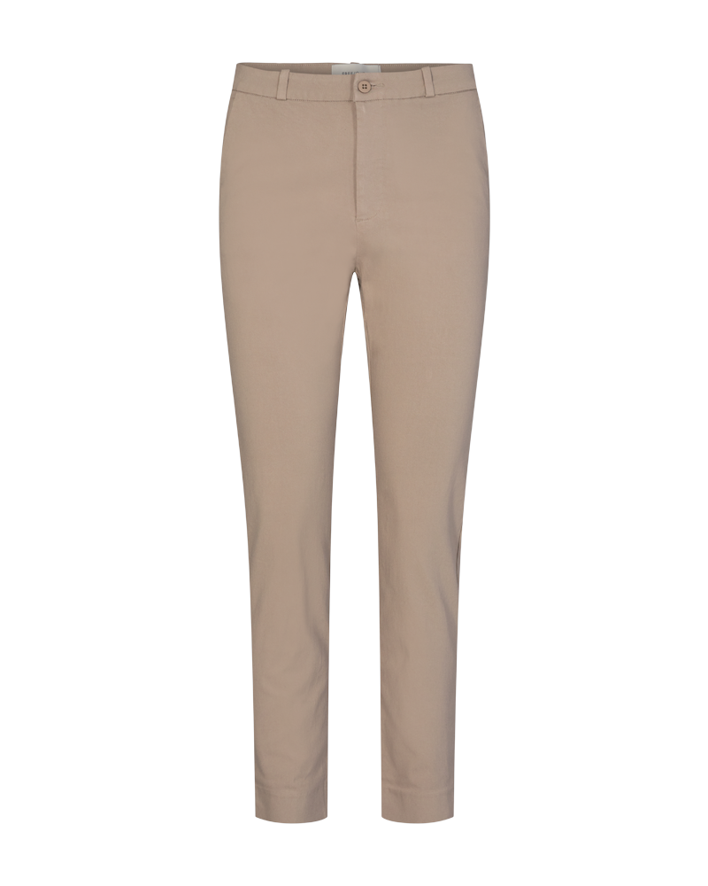 Buxur frá Freequent úr mjúku og teygjanlegu efni. Buxurnar eru einfaldar með þröngu sniði, hnappum og rennilás, háu mitti, hliðarvösum og rifum í ökklalöngum fótleggjum.