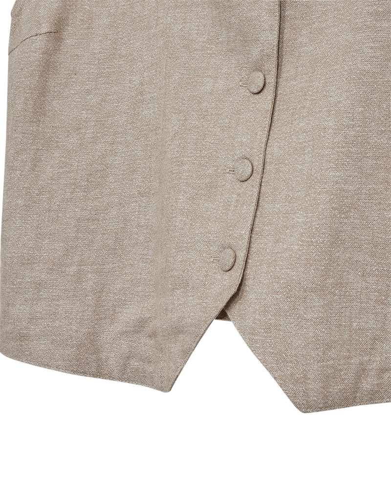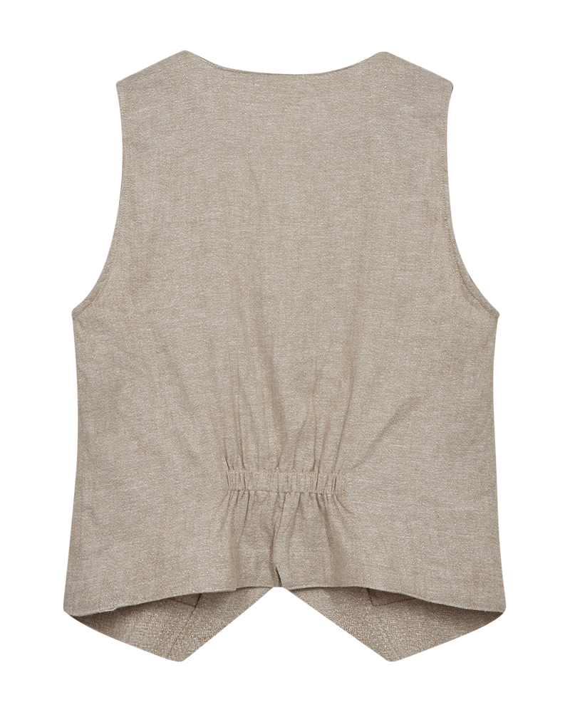 Vesti frá Freequent úr línefni. Vestið hefur einfalda útlínu með V-hálsmáli, hnappum sem eru klæddir efni og teygjubandi