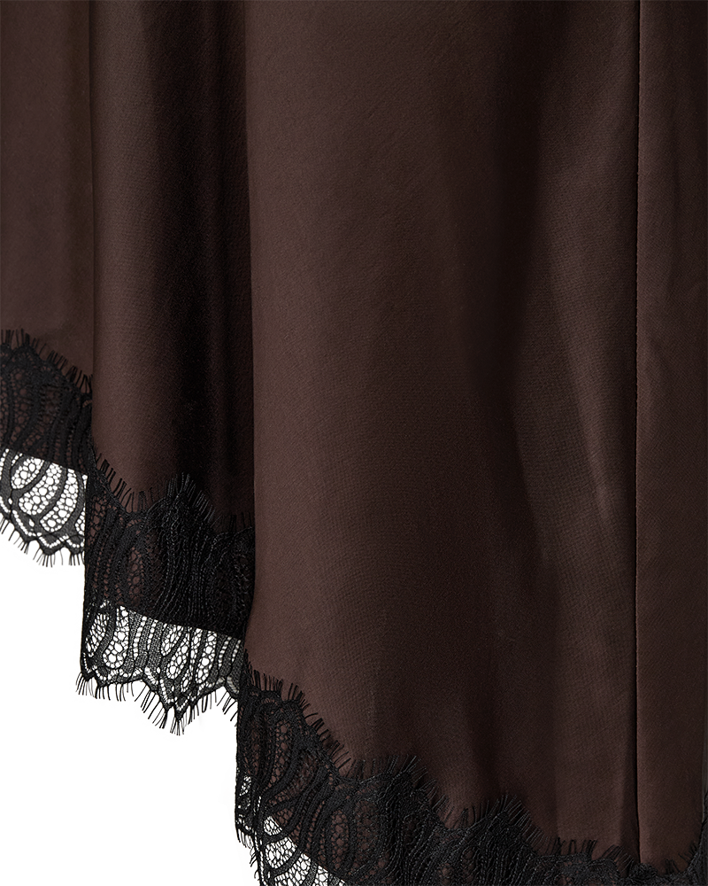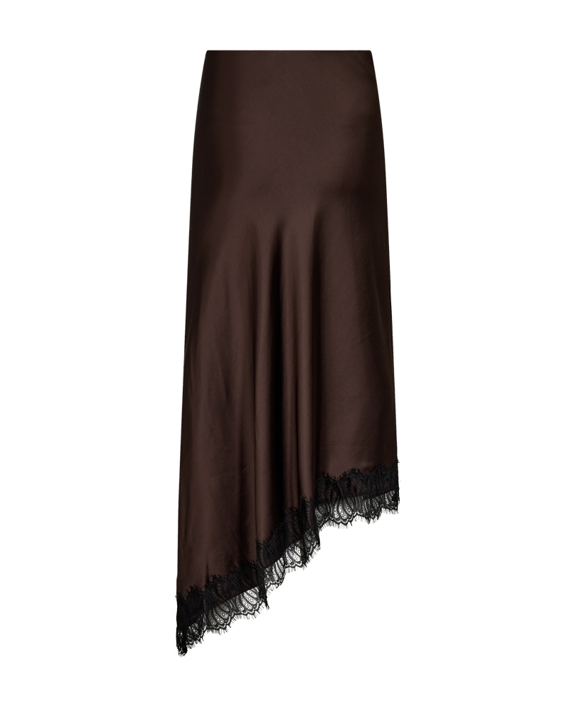 Pils frá Freequent úr sléttu ofnu satíni með mjúkum gljáa, skorið á skáhalla til að skapa glæsilegt fall og flæðandi hreyfingu. Skuggamyndin fylgir líkamanum mjúklega án þess að klístrast og er kláruð með ósamhverfum faldi og fíngerðum blúndukanti sem bætir við fágaðan andstæðu. Teygja inni í mittisbandinu tryggir þægilega notkun og hreint útlit.