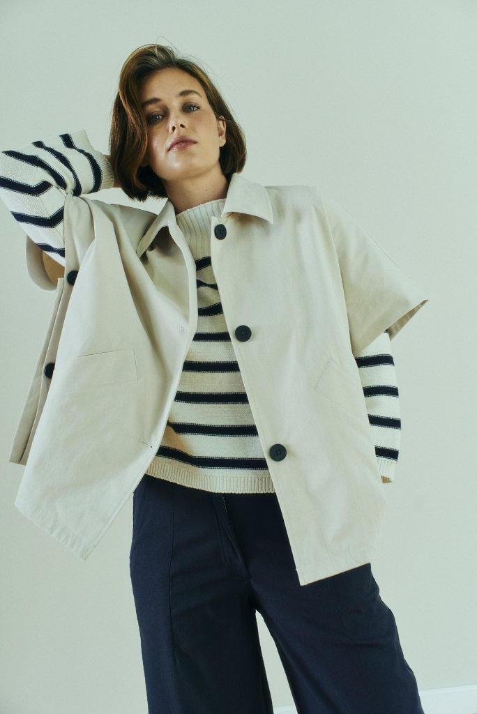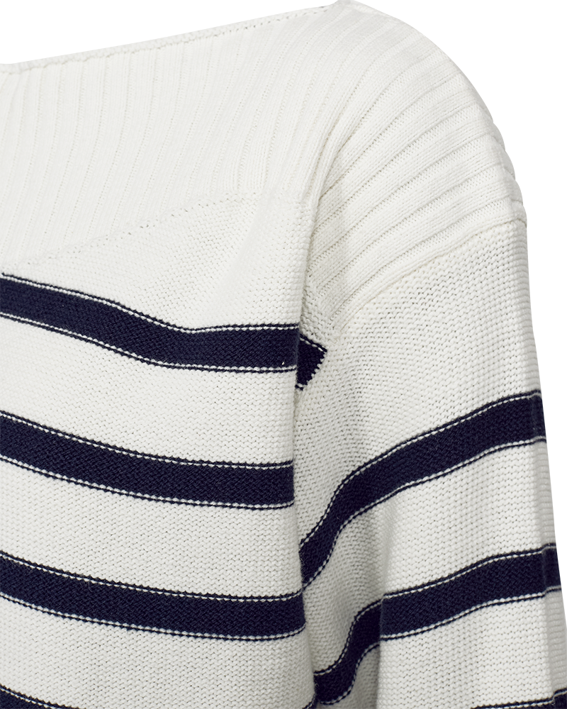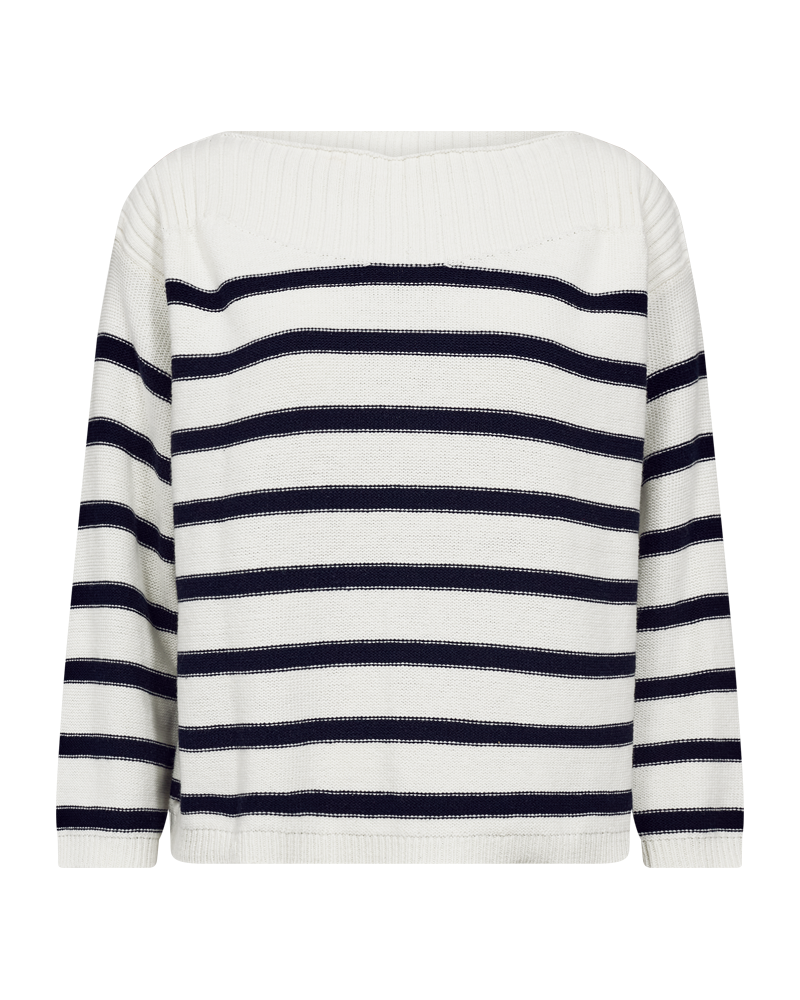 Peysa frá Freequent úr mjúku, fínprjónuðu efni með röndóttu mynstri. Peysan hefur einfalda útlínu með lausum sniði, bátshálsmáli og rifjum.