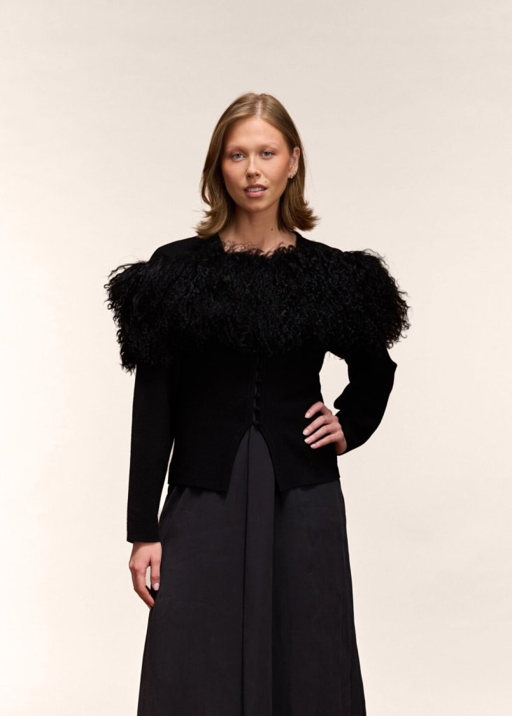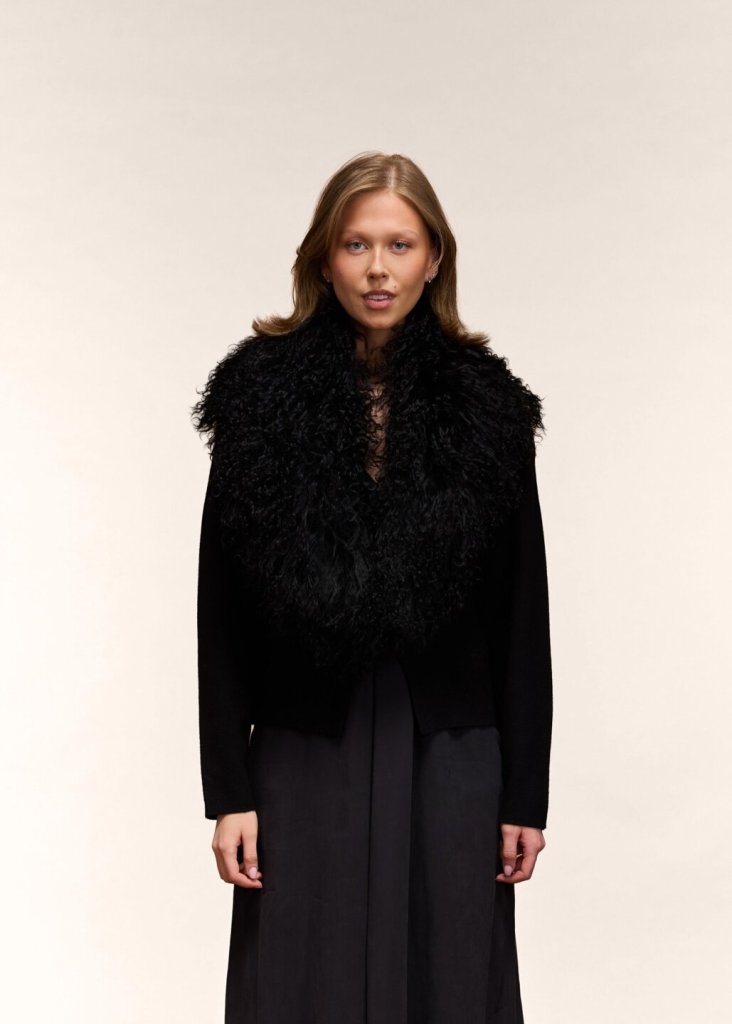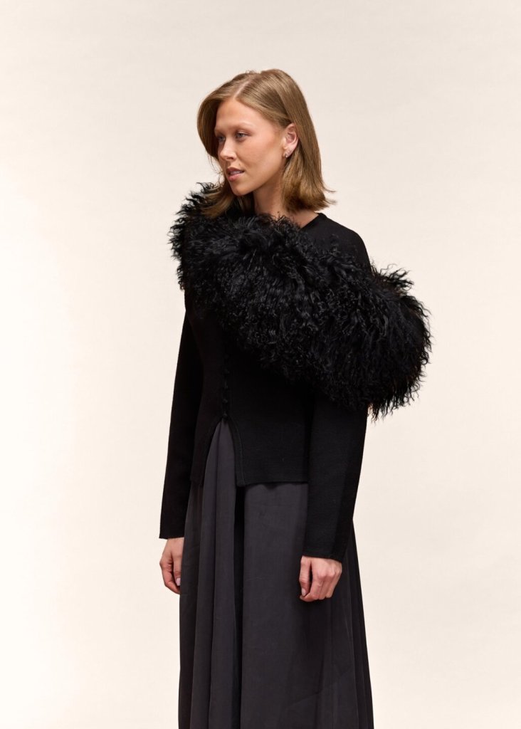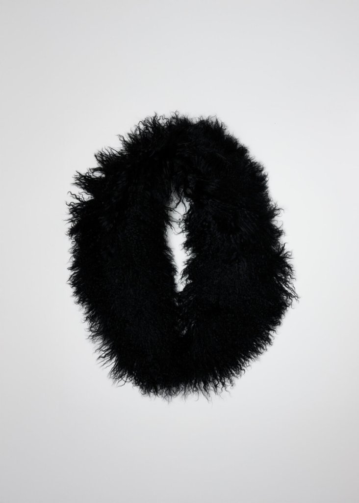 Myrkvi er flottur loðkragi framleiddur úr hágæða tíbet lambaskinni. Skinnið er náttúrulega krullað sem gefur kraganum einstaklega skemmtilega áferð. Myrkva kragann er hægt að nota við Dimmu ermastúkurnar. Parið getur breytt einföldum jakka í einstaka flík. Kraginn er hannaður með klemmur á báðum endum svo hægt er að festa hann á allskonar jakka, kjóla og blússur. Hann er einnig hægt að krækja saman og smeygja yfir aðra öxlina, fyrir nýstárlegt og skemmtilegt look.